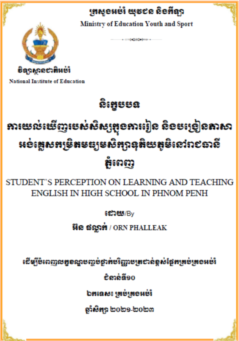 ប្រធានបទ៖ ប្រសិទ្ធភាពនៃការអនុវត្តគម្រោងកែលម្អគុណភាពអប់រំនៅមធ្យមសិក្សា ដែលជួយដល់ការបង្រៀន និងរៀននៅវិទ្យាលយ័បវេល ករណីសិក្សា៖ ខេត្តបាត់ដំបង